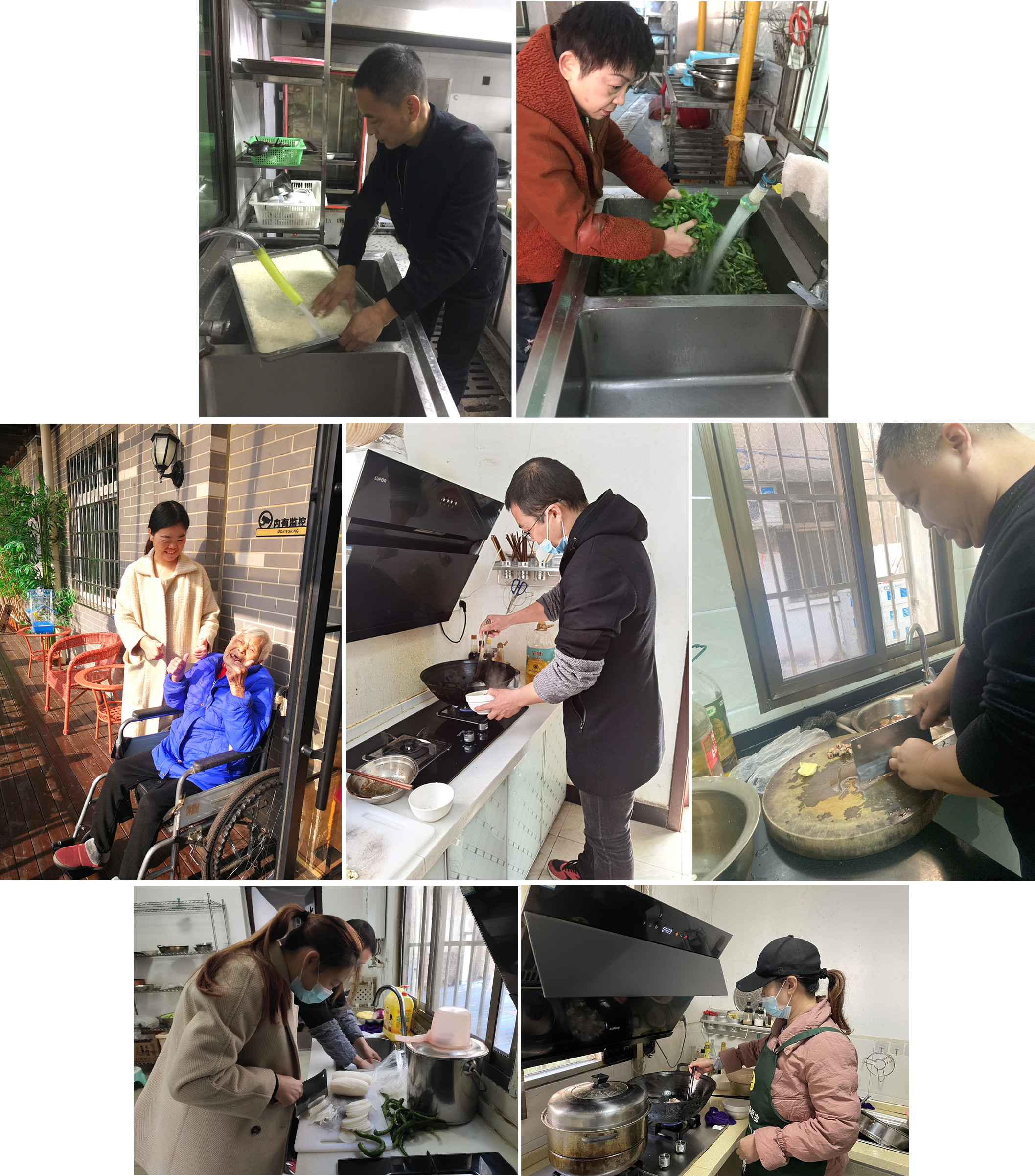 對接清楚后,每位同事都有條不紊的開啟了工作...廚房幫廚...搞衛(wèi)生...帶爺爺奶奶們出去曬太陽...更有同事大顯身手,為爺爺奶奶們制作可口的養(yǎng)生餐。(雖然可能沒有護理員姐姐們做的美味,但是滿滿的誠意在)