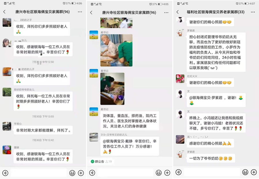 院內(nèi)外設(shè)置物資接受消毒區(qū)、隔離區(qū),公司統(tǒng)一運(yùn)送所有物資,每日兩消兩查,即時(shí)更新2碼1記錄。每位銀海人在這關(guān)鍵的時(shí)刻絕不掉鏈子,積極組織老人與家屬視頻連線,緩解老人及家屬的焦慮,組織爺爺奶奶在院內(nèi)開展康樂活動(dòng),豐富日常生活。