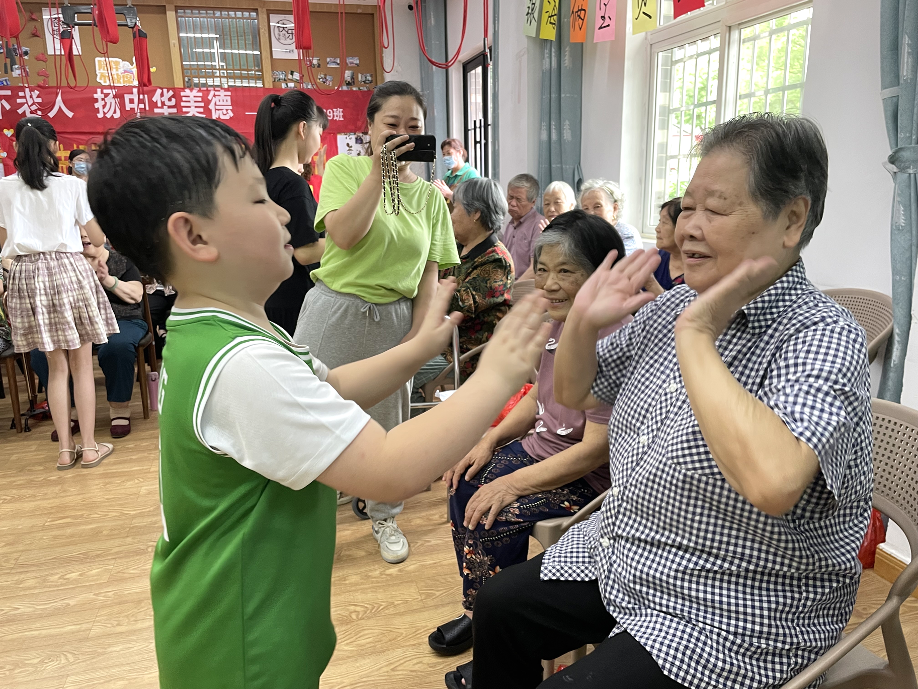 一句甜甜的問候,拉近了孩子們和老人之間的距離。孩子們扶著老人坐下,為老人分發(fā)點心、捶背,爺爺奶奶也被孩子們的溫暖舉動逗得喜笑顏開。