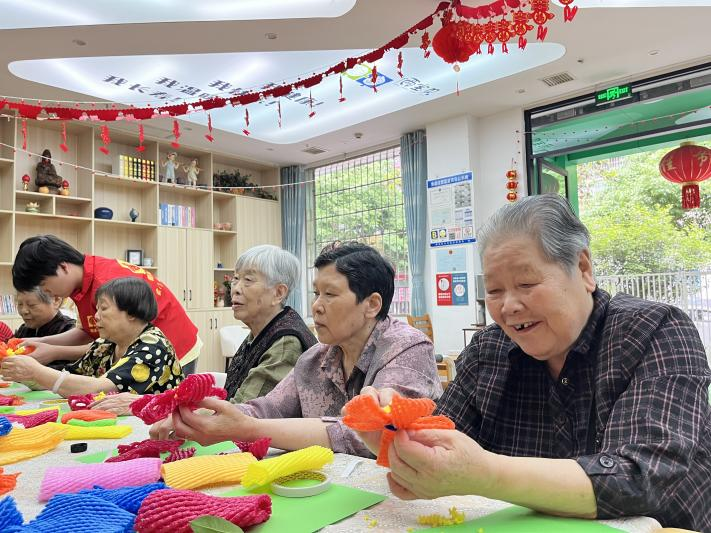 社工們精心布置了場(chǎng)地,準(zhǔn)備了充足的材料,安排老人們就坐。隨著講解員講解制作方法,長(zhǎng)者們紛紛挑選了各自喜愛的顏色,開始制作。他們小心翼翼地將泡沫網(wǎng)套剪出花瓣形狀,精心打磨邊緣,確保每一片花瓣都邊緣光滑且大小形狀一致。在這個(gè)過程中,爺爺奶奶們互相交流技巧,彼此協(xié)助,現(xiàn)場(chǎng)氣氛溫馨而活躍。
